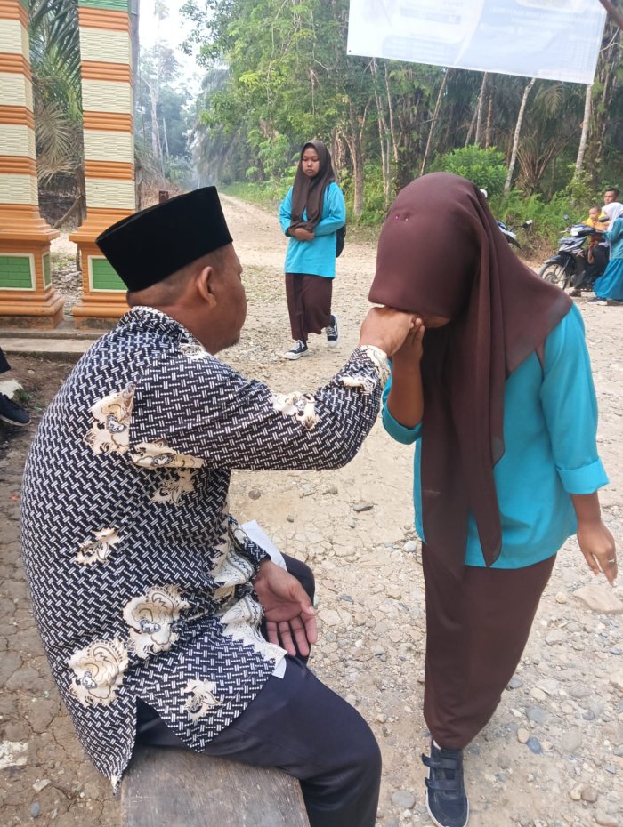 Setiap pagi di MTsN 6 Merangin, suasana hangat dan penuh kebersamaan tercipta ketika para guru menyambut kedatangan siswa-siswi di gerbang madrasah. Tradisi ini telah menjadi bagian dari rutinitas harian sebelum kegiatan belajar mengajar dimulai. Guru-guru berdiri berjajar rapi, menyapa siswa dengan salam dan senyum, sementara para siswa dengan tertib membalas salam dan bersalaman sebagai bentuk penghormatan.